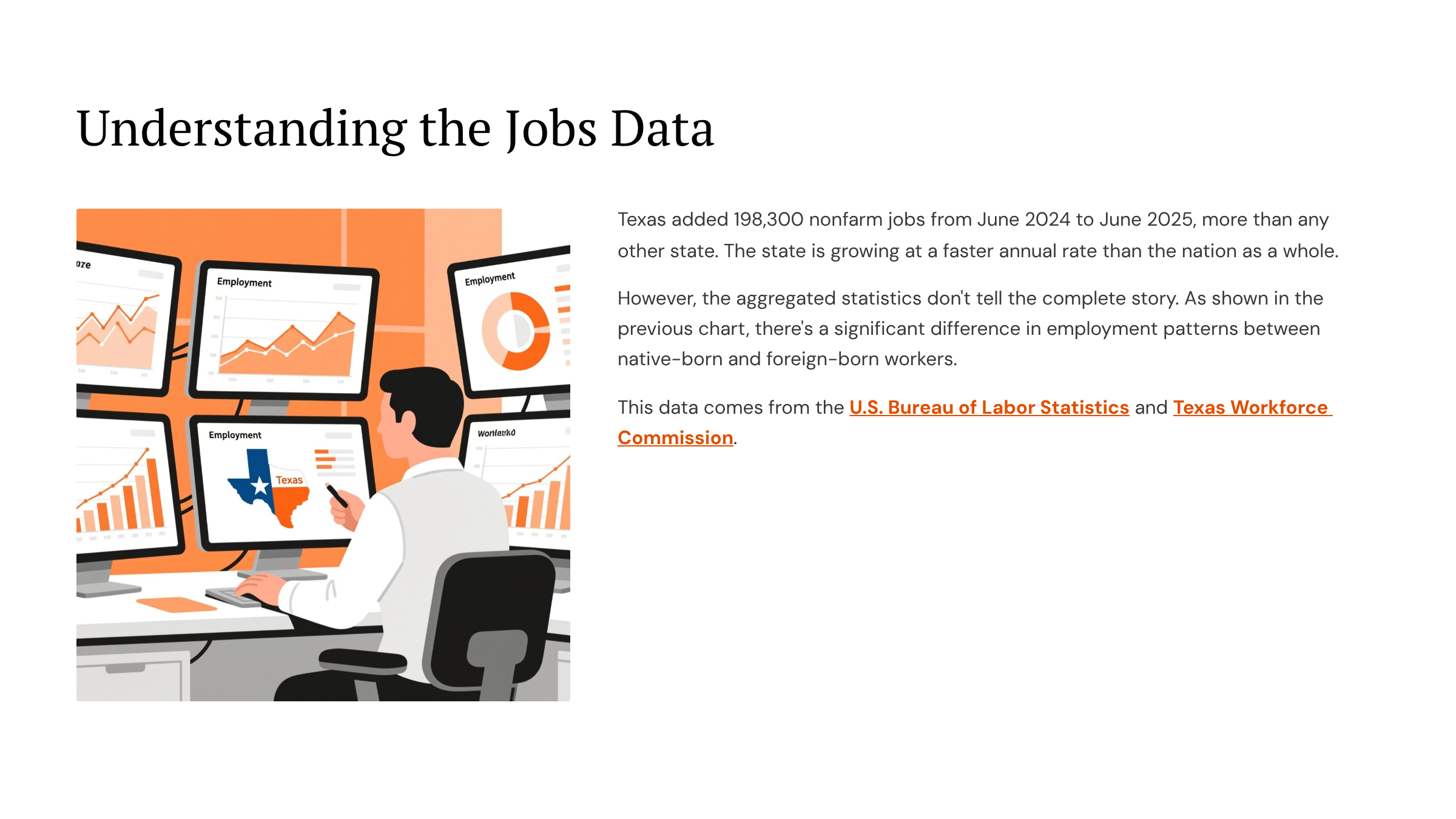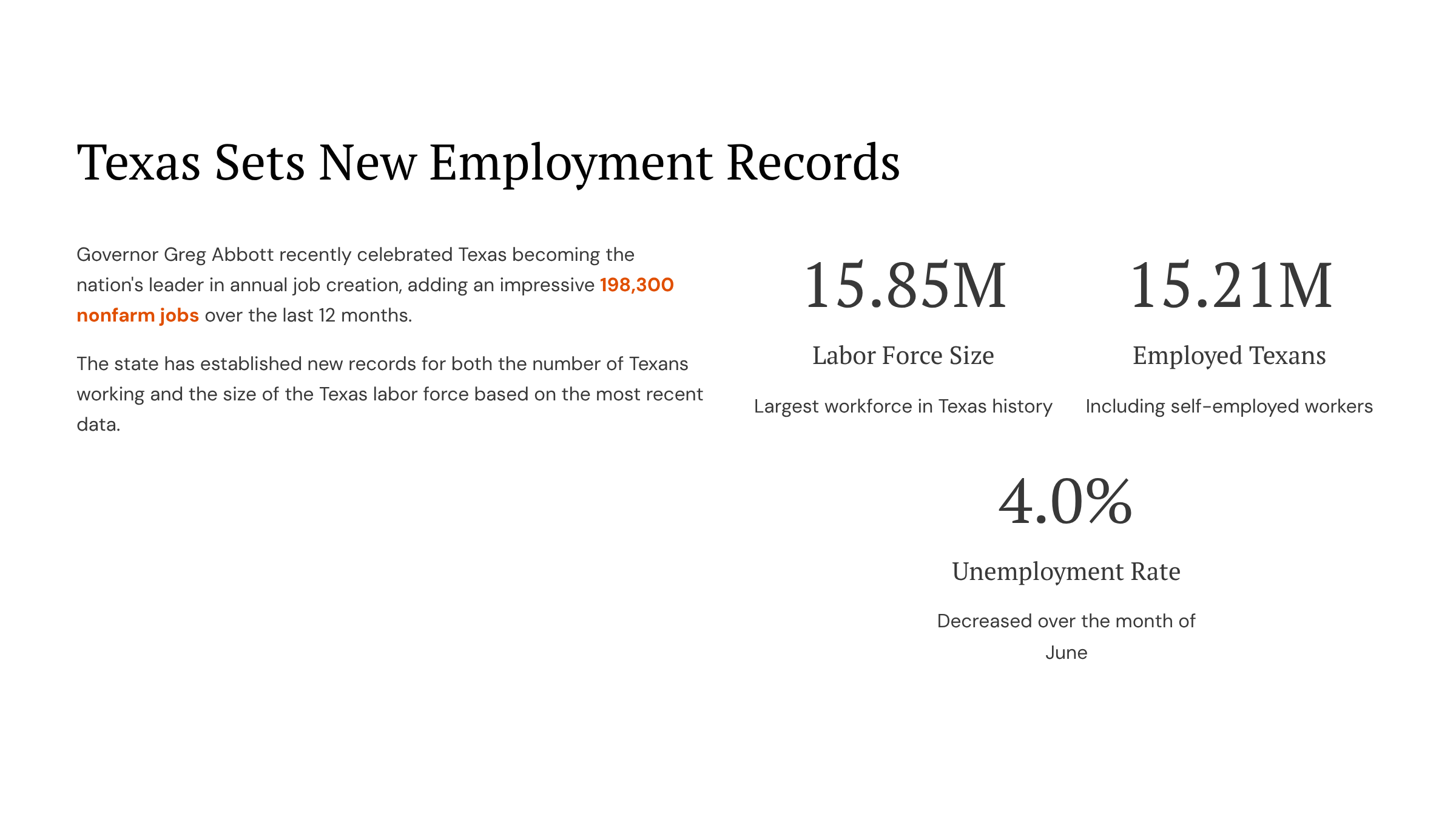 Governor Abbott’s recent press release declared Texas “America’s jobs leader” with 195,600 jobs gained over the last year